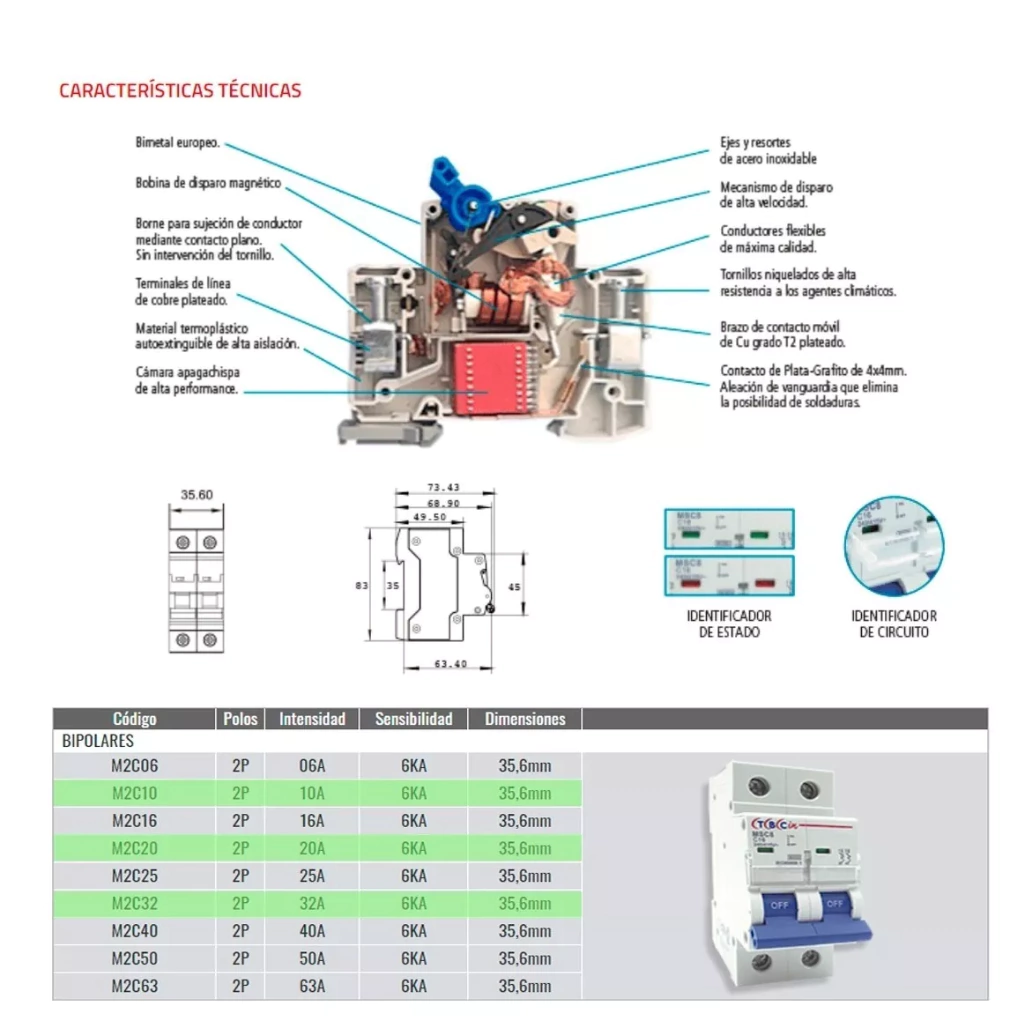 3 Llaves térmicas bipolares – 10A, 25A y 32A – 6kA