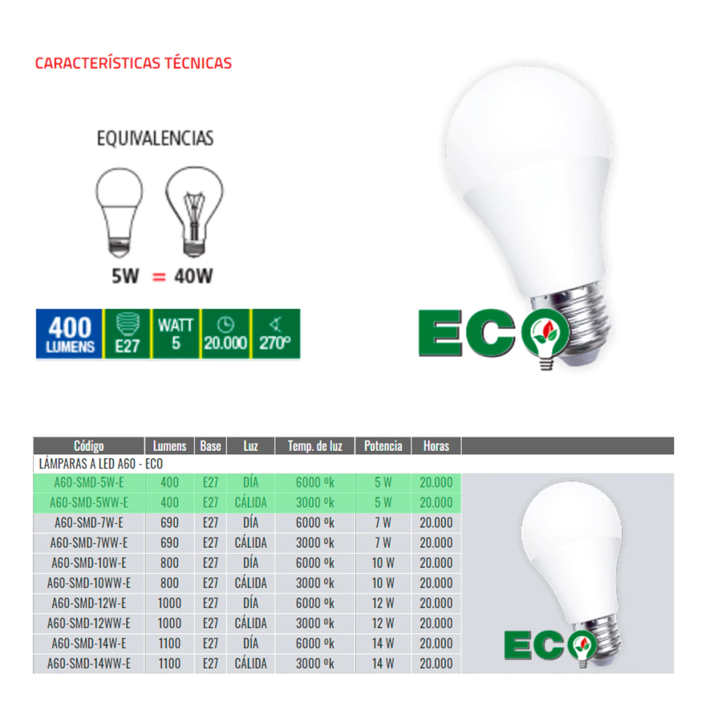 Lámpara LED Bulbo E27 5W A60 TBCIN - Luz Día / Luz Cálida
