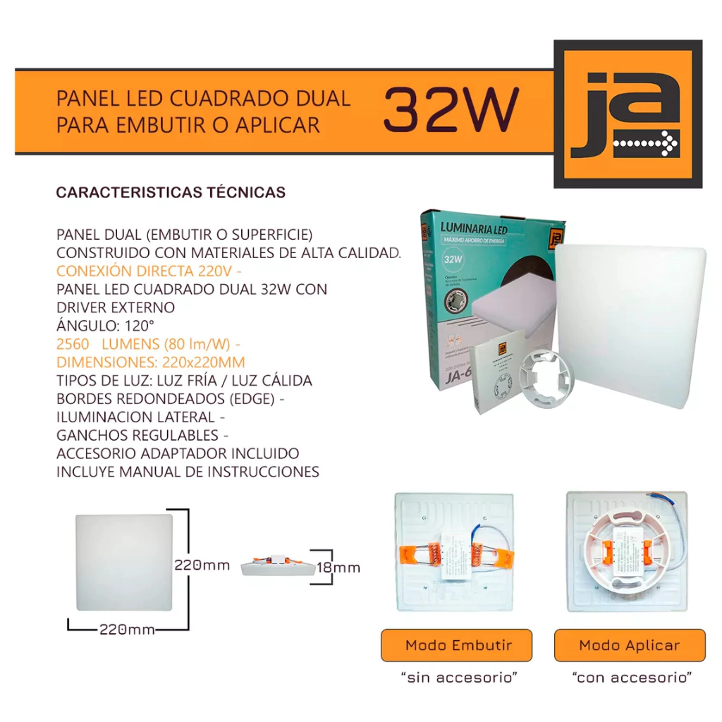 El Panel Plafón LED 32W Cuadrado JA ofrece una iluminación moderna y versátil para cualquier ambiente. Disponible en dos variantes: Luz Fría para ambientes energizantes y Luz Cálida para crear espacios acogedores. Su diseño cuadrado y ultra delgado (solo 2 cm de altura) se adapta a cualquier estilo de decoración.