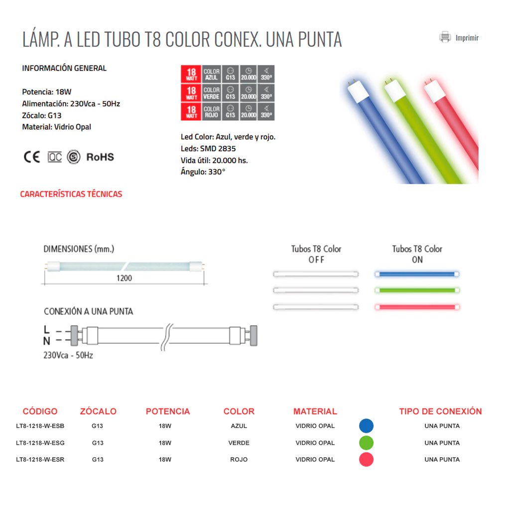Colores disponibles: Rojo (LT8-1218-W-ESR), Verde (LT8-1218-W-ESG), Azul (LT8-1218-W-ESB).
